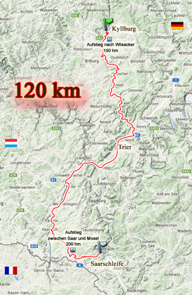 Samstag, 22.08.2015: Dreisbach bei Mettlach → Remich → Trier → Kordel → Kyllburg Übernachtung auf dem Stiftsberg
